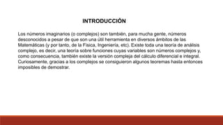 Este documento presenta una introducción a los números complejos. Explica que un número complejo está formado por una parte real y una parte imaginaria. Detalla las operaciones básicas con números complejos como suma, resta, multiplicación y división. También describe la representación gráfica de los números complejos en un plano complejo y la forma polar y exponencial de representarlos. Finalmente, introduce conceptos como el módulo, la conjugada y el teorema de Moivre para elevar números complejos a potencias.