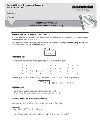 Este documento introduce los números complejos, incluyendo la unidad imaginaria i, cuyo cuadrado es -1. Explica cómo calcular potencias de i y raíces cuadradas de números negativos. Luego define números complejos como la suma de una parte real y una parte imaginaria, y muestra cómo representarlos gráficamente y realizar operaciones como suma y resta con ellos. Finalmente, presenta ejercicios para practicar estos conceptos.