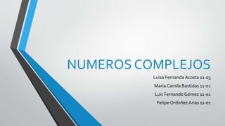Este documento describe los números complejos, incluyendo su historia, representaciones y operaciones. Los números complejos surgieron originalmente de la necesidad de encontrar raíces para ecuaciones que involucran números negativos. Cardan los introdujo en 1545 mientras investigaba raíces polinominales. Más tarde, Wessel proporcionó una representación adecuada usando vectores. Los números complejos se pueden representar y operar en formas trigonométrica, polar y cartesiana.