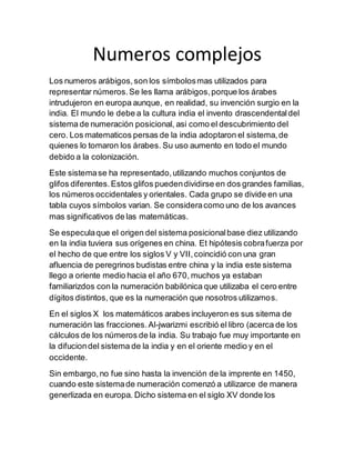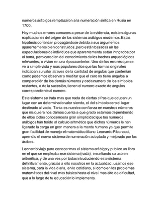 El documento describe el origen y la evolución del sistema de numeración arábigo. Se origina en la India y es adoptado por los árabes, quienes lo popularizan en el mundo. Los matemáticos árabes lo perfeccionan en los siglos X y XI. Sin embargo, no es hasta la invención de la imprenta en 1450 cuando se generaliza su uso en Europa, reemplazando a otros sistemas como el romano y el cirílico. El sistema numérico arábigo, con su uso del cero y la posición, ha simplificado enorme