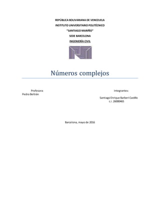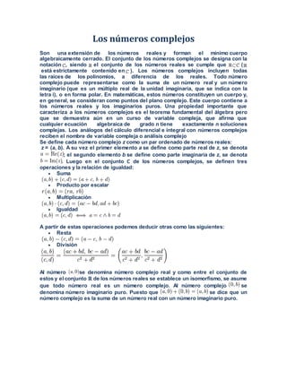 Este documento describe los números complejos y sus diferentes formas de representación. 1) Los números complejos son una extensión de los números reales que incluyen raíces de polinomios. 2) Pueden representarse en forma binómica, polar o exponencial. 3) Las operaciones básicas como suma, resta, multiplicación y división se definen para los números complejos.