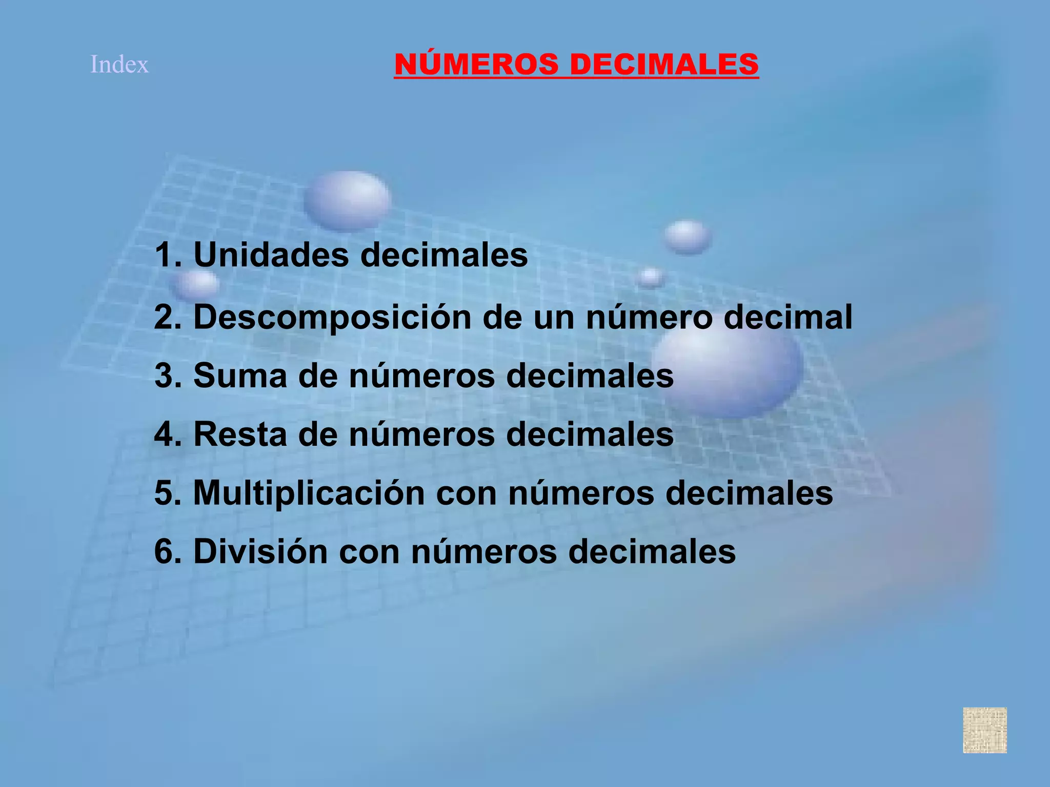 El documento explica los conceptos básicos de los números decimales, incluyendo unidades decimales, descomposición de números decimales, suma, resta, multiplicación y división con números decimales. Se proporcionan ejemplos para ilustrar cada operación.