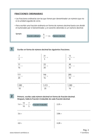 Este documento explica las fracciones decimales y cómo convertir entre fracciones decimales y números decimales. Las fracciones decimales tienen un denominador que es una potencia de 10, como 0.5 donde el denominador es 100. Para escribir una fracción decimal como un número decimal, solo se escribe el numerador y se separa con una coma las cifras decimales. Para convertir de número decimal a fracción decimal, se escribe el número decimal sin coma como el numerador sobre la unidad seguida de tantos ceros como cifras decimales. También explica cómo convertir fracciones ordinarias a números decimal