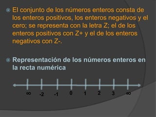 El conjunto de los números enteros (Z) incluye los números positivos, negativos y cero. Las operaciones de suma y multiplicación de números enteros siguen propiedades como la cerradura, asociatividad, conmutatividad y la existencia de un elemento neutro. La suma de números enteros siempre da como resultado otro número entero, mientras que el producto de un número entero por 1 no lo modifica.