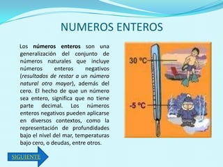 Los números enteros generalizan los números naturales para incluir ceros y números negativos. Los números enteros no tienen parte decimal y pueden usarse para representar cantidades como profundidades bajo el nivel del mar, temperaturas bajo cero o deudas. En la recta numérica, los números enteros se representan colocando puntos sucesivos a la izquierda y derecha del cero para los números negativos y positivos respectivamente, con distancias iguales que representan la unidad.