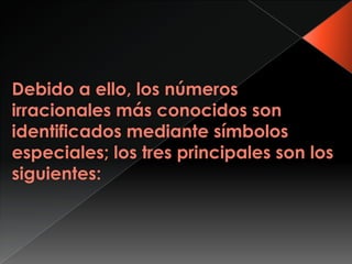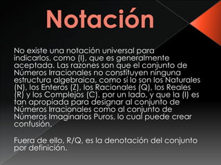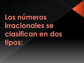El documento define un número irracional como un número real que no puede expresarse como una fracción de enteros, donde el numerador y el denominador son diferentes de cero. Explica que los números irracionales llenan los vacíos dejados por los números racionales en la recta numérica real. Además, distingue entre números algebraicos, que pueden representarse mediante raíces libres o anidadas de una ecuación algebraica, y números trascendentes, que no pueden expresarse de esa forma y provienen de funciones trascendentes.