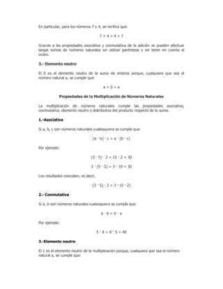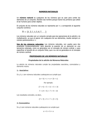 Los números naturales son los números usados para contar objetos. Incluyen los números 1, 2, 3, etc. y tienen propiedades como la asociatividad y conmutatividad para las operaciones de suma y multiplicación. Las propiedades de las operaciones de suma, resta, multiplicación y división de números naturales cumplen con reglas específicas.