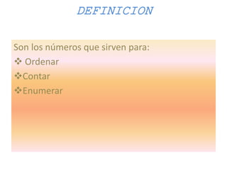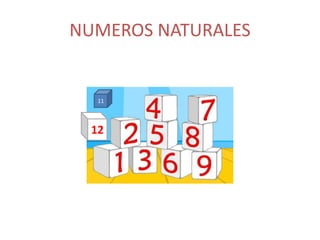 Los números naturales son números que se usan para ordenar, contar y enumerar. Se representan en una recta numérica y están ordenados de tal forma que para cualquier par de números naturales a y b, a es menor, mayor o igual que b. Las operaciones de suma y multiplicación de números naturales siempre dan como resultado otro número natural y poseen propiedades como la conmutatividad, asociatividad y la existencia de elementos neutros y absorventes.