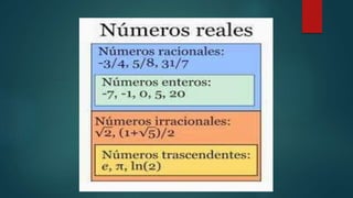 El documento habla sobre relaciones de orden y números reales. Explica que una relación binaria es de orden cuando cumple las propiedades de reflexividad, antisimetría y transitividad. También habla sobre intervalos de números reales, incluyendo intervalos cerrados, abiertos, cerrado-abiertos y operaciones entre intervalos como unión e intersección.