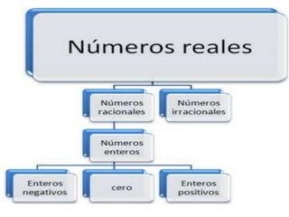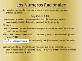 Los números racionales son aquellos que pueden expresarse como el cociente de dos números enteros y pueden describirse como aquellos cuya representación decimal es eventualmente periódica. Los números reales incluyen tanto a los números racionales como a los números irracionales, que no pueden expresarse como fracciones de números enteros. El conjunto de números reales es denso, ordenado y completo.