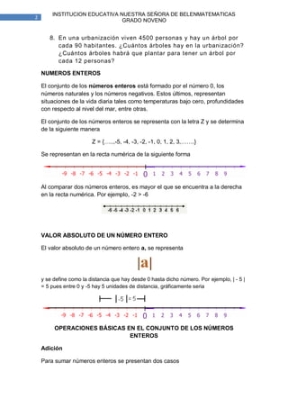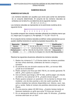 Este documento presenta conceptos básicos sobre números naturales, enteros y racionales. Explica que los naturales son los números de conteo y forman el conjunto N. Los enteros incluyen los naturales y sus opuestos, formando el conjunto Z. Se definen operaciones como suma, resta, multiplicación y división para enteros. Finalmente, introduce los racionales como números de la forma a/b, donde a y b son enteros y b ≠ 0, formando el conjunto Q. El documento contiene también ejemplos y ejercicios para aplicar estos conceptos.