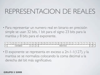 Este documento explica la representación de números reales en coma flotante de precisión simple de 32 bits. Se utilizan 1 bit para el signo, 8 bits para el exponente y 23 bits para la mantisa. El exponente se representa en exceso de 127 y la mantisa se normaliza colocando la coma decimal después del primer bit significativo. Además, se muestran ejemplos de valores límite y la conversión de un número binario a decimal.