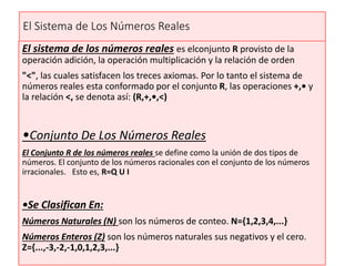 El documento trata sobre el sistema de números reales, incluyendo su definición, clasificación en racionales e irracionales, y las propiedades básicas que los rigen. También se abordan las inecuaciones y desigualdades, así como su resolución, incluyendo inecuaciones de primer y segundo grado, y valor absoluto. Finalmente, se presentan ejemplos y métodos para representar gráficamente las soluciones de estas inecuaciones.