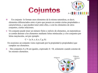 El documento explica conceptos básicos de conjuntos y operaciones con conjuntos como unión, intersección, diferencia y complemento. También define números naturales, enteros, racionales e irracionales. Explica desigualdades matemáticas, valor absoluto y desigualdades de valor absoluto.