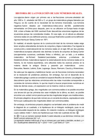 Este documento describe la historia de la evolución de los números reales desde su origen en las civilizaciones antiguas hasta su definición rigurosa en el siglo XIX. Los egipcios y griegos desarrollaron las fracciones racionales y se dieron cuenta de la existencia de los irracionales. Los números negativos fueron introducidos por matemáticos indios y chinos. Aunque los números reales se usaban en cálculo desde el siglo XVII, no fue hasta 1871 que Georg Cantor les dio una definición precisa usando teoría de