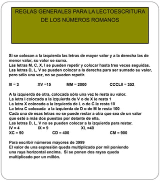 El documento presenta el sistema de numeración romano, incluyendo las letras y sus valores equivalentes en decimal, las reglas para sumar y restar valores, y cómo escribir números mayores de 3999. También incluye ejemplos prácticos de cómo descomponer números para escribirlos en romano y ejercicios de conversión entre los sistemas romano y decimal.