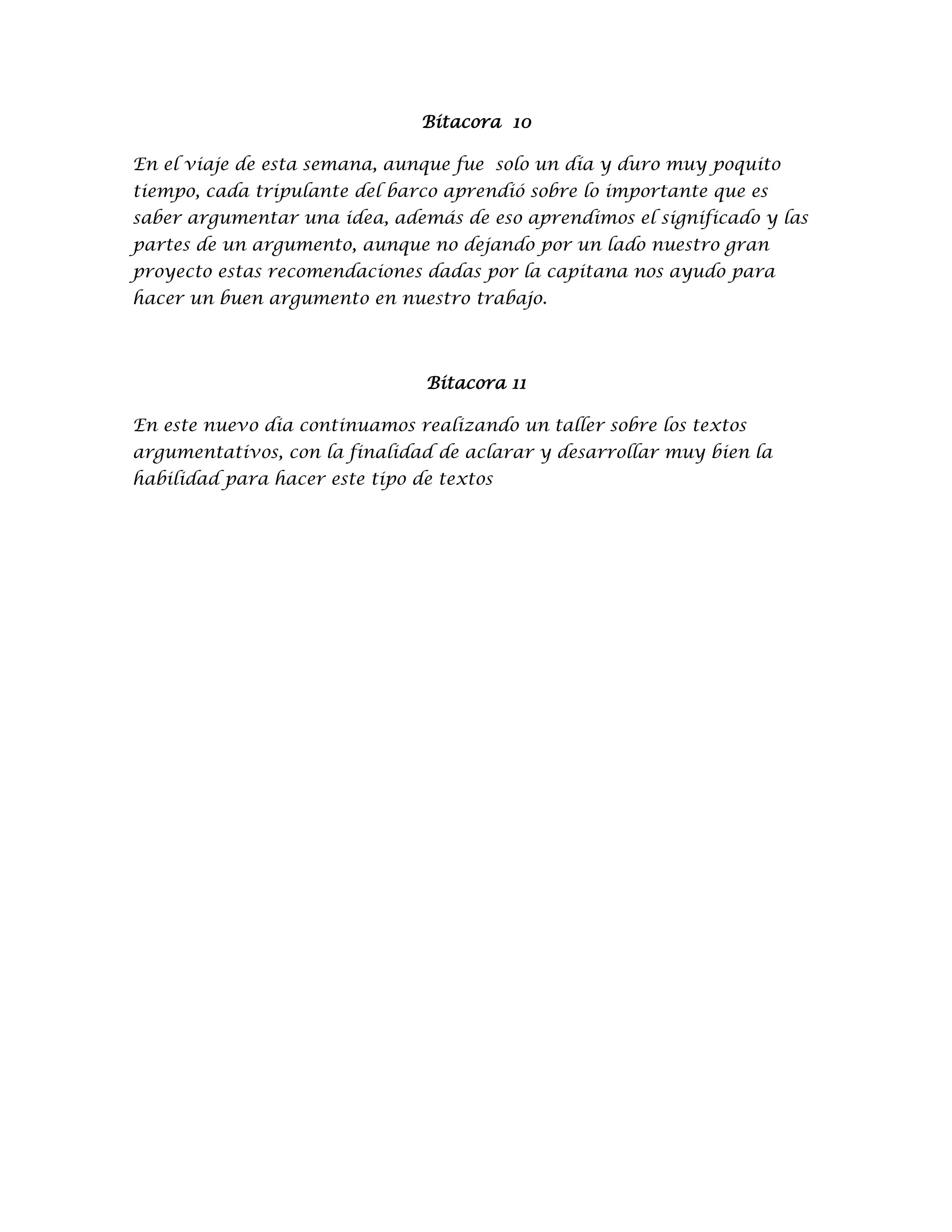 La bitácora 10 describe una lección sobre cómo argumentar ideas efectivamente y los componentes de un argumento. La bitácora 11 indica que el taller continuó enfocándose en textos argumentativos para mejorar las habilidades de producir este tipo de textos.