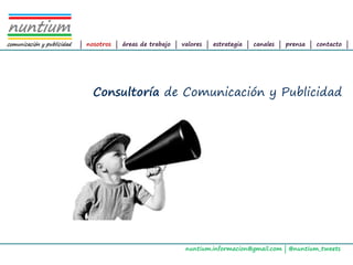Altair es una consultora de comunicación y publicidad que ofrece servicios como comunicación interna, planificación publicitaria y relación con los medios. Sus valores son el compromiso, la cercanía y la calidad. Su estrategia se basa en técnicas de creatividad publicitaria, planes de comunicación personalizados y acciones de potenciación de la marca a través de medios convencionales y no convencionales. Proporciona información de contacto a través de correo electrónico, Twitter y su ubicación en Ferrol.
