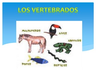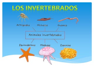 Este documento describe las características de los animales. Los animales son seres pluricelulares heterótrofos que tienen órganos de los sentidos y pueden desplazarse. Se dividen en invertebrados, que carecen de esqueleto interno o columna vertebral, y vertebrados, que poseen esqueleto interno y columna vertebral. Tanto los invertebrados como los vertebrados realizan funciones vitales como la nutrición, la respiración y la relación con el medio.