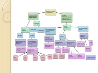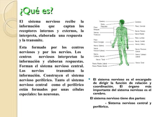 El documento describe el sistema nervioso, incluyendo que está formado por el sistema nervioso central y periférico, y que ambos están compuestos de neuronas. El sistema nervioso central incluye el cerebro, cerebelo y médula espinal, y se encarga de procesar la información y coordinar las funciones del cuerpo. El sistema nervioso periférico incluye los nervios que transmiten información entre los órganos y el sistema nervioso central.