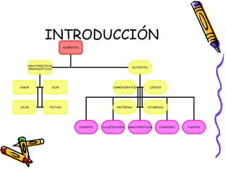 El documento describe las características organolépticas, químicas y nutritivas de los alimentos. Explica las propiedades del sabor, olor, color y textura de los alimentos, así como las características y fuentes principales de hidratos de carbono, lípidos y proteínas. Finalmente, detalla la clasificación y tipos de ácidos grasos presentes en los lípidos.
