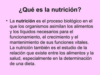 Este documento trata sobre la nutrición y sus componentes fundamentales. Define la nutrición como el proceso biológico de asimilación de alimentos y líquidos para el funcionamiento, crecimiento y mantenimiento del organismo. Explica que una nutrición adecuada cubre los requerimientos energéticos, de micronutrientes, hidratación y fibra, representados gráficamente en la pirámide nutricional. Además, detalla la clasificación de aminoácidos en esenciales y no esenciales,