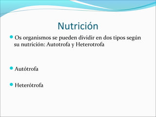 La nutrición de los organismos puede ser autotrófa u heterotrófa. La digestión transforma los alimentos en moléculas más sencillas para que puedan ser absorbidas por las células a través de la ingestión, digestión, absorción y egestión. Los diferentes filos presentan variaciones en la estructura y funcionamiento del aparato digestivo, desde la cavidad gástrica simple de los poríferos hasta el tubo digestivo completo de los vertebrados, pero en general comparten las etapas básicas del proceso digestivo.