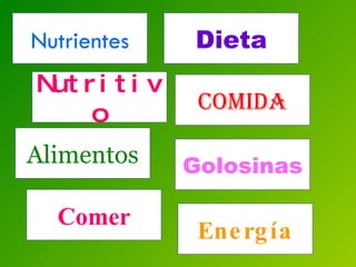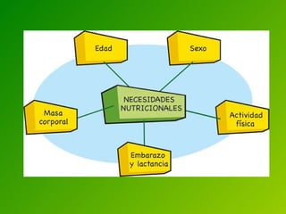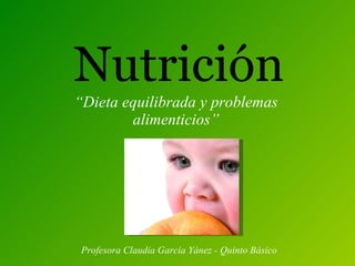 El documento habla sobre la nutrición y los problemas alimenticios. Explica que los seres vivos necesitan nutrientes y energía de los alimentos para construir sus estructuras y realizar funciones vitales. Los principales nutrientes son los carbohidratos, lípidos, proteínas, agua, vitaminas y minerales. También presenta la pirámide alimenticia y explica que comer más o menos calorías de las necesarias puede causar obesidad o desnutrición. Finalmente, menciona trastornos alimenticios como la anorexia y