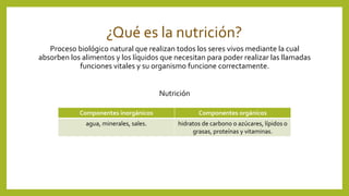 Este documento trata sobre la nutrición. Define la nutrición como el proceso biológico mediante el cual los seres vivos absorben los alimentos y líquidos necesarios para realizar sus funciones vitales. Explica que la nutrición incluye componentes inorgánicos como el agua y minerales, y componentes orgánicos como carbohidratos, lípidos, proteínas y vitaminas. Además, describe los procesos de la digestión, la respiración, la circulación y la excreción como parte integral de la nutrición. Final