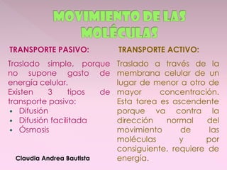 Las células tienen diferentes mecanismos para transportar sustancias a través de la membrana, ya sea de forma pasiva sin requerir energía o de forma activa requiriendo energía. El transporte pasivo incluye la difusión, difusión facilitada y ósmosis, mientras que el transporte activo usa proteínas transportadoras y requiere ATP. Además, las células pueden internalizar y externalizar material a través de procesos como la endocitosis, exocitosis y fagocitosis.
