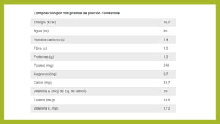 La lechuga (Lactuca sativa) es una hortaliza de la familia Asteraceae. Su nombre genérico "Lactuca" proviene del latín y significa leche, refiriéndose al líquido lechoso que exuda su tallo cuando se corta. La lechuga tiene vitaminas A, B, C y E, así como minerales como magnesio, potasio y calcio. Tiene propiedades beneficiosas como diurética, antioxidante, reguladora del azúcar en sangre y facilitadora de la digestión.