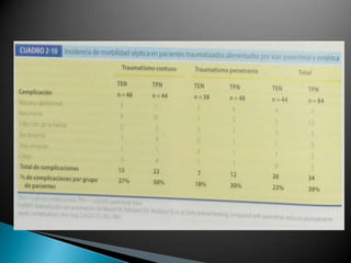 La nutrición parenteral consiste en administrar de forma continua una solución hiperosmolar que contiene nutrientes a través de un catéter intravenoso. Debe tener una adecuada relación de calorías y proteínas. Se usa principalmente para pacientes graves con desnutrición, sepsis, traumatismos o cuando no es posible usar el tubo digestivo. Requiere seleccionar cuidadosamente a los pacientes y conocer las posibles complicaciones.