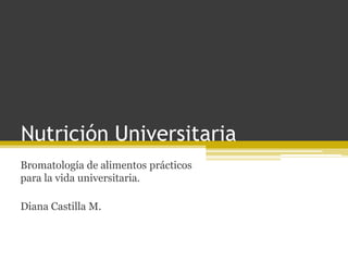 Este documento proporciona información sobre nutrición saludable para estudiantes universitarios. Explica que una alimentación balanceada y actividad física regular pueden ayudar a mantener un buen estado de salud y rendimiento académico. También recomienda incluir varios grupos de alimentos como frutas, verduras, granos enteros, proteínas magras y lácteos en las comidas diarias, y sustituir opciones menos saludables por alternativas mejores.