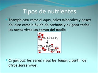 El documento describe diferentes tipos de nutrientes y modalidades de nutrición en organismos vivos. Los nutrientes pueden ser inorgánicos como agua, sales minerales y gases, u orgánicos obtenidos de otros organismos. Los organismos se clasifican según su metabolismo y cómo obtienen nutrientes, ya sea a través de la fotosíntesis, la descomposición de materia orgánica, el parasitismo, o la ingesta de alimentos.