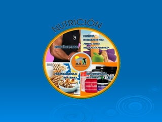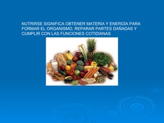 La nutrición implica obtener materia y energía para formar y reparar el organismo y cumplir con sus funciones. En el proceso de nutrición intervienen la digestión, respiración, circulación y excreción a través de los sistemas digestivo, respiratorio, circulatorio y excretor, respectivamente. Estos sistemas degradan los alimentos, intercambian oxígeno y dióxido de carbono, transportan nutrientes y desechos, y eliminan los desechos del cuerpo.
