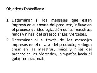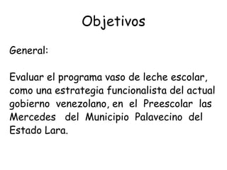 El documento evalúa el programa "Vaso de Leche Escolar" del gobierno venezolano para determinar si los mensajes en el envase influyen en la ideologización de maestras y niños y si crean simpatía hacia el gobierno. Se aplicó un cuestionario y entrevistas a maestras para medir estas variables. Los resultados mostraron una opinión favorable a los mensajes y al gobierno, indicando que la estrategia comunicacional fue efectiva desde una perspectiva funcionalista que busca conservar el sistema social.