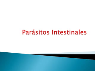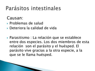 Este documento describe los parásitos intestinales, sus causas, síntomas y formas de transmisión. Los parásitos intestinales como los gusanos y protozoos viven en el intestino delgado y grueso del huésped, consumiendo sus nutrientes y causando problemas de salud y calidad de vida como anemia, debilidad y diarrea. Se transmiten principalmente a través de la ingestión de alimentos, agua o suelo contaminados con heces que contienen huevos o quistes de parásitos. Algunos de los parásitos