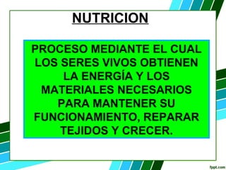 El documento habla sobre la nutrición en el ser humano. La nutrición es el proceso mediante el cual los seres vivos obtienen la energía y los materiales necesarios para mantener su funcionamiento, reparar tejidos y crecer. Incluye el conjunto de procesos que nos permiten utilizar y transformar las sustancias que necesitamos para mantenernos vivos, como hidratos de carbono, grasas, vitaminas y proteínas. El metabolismo incluye reacciones catabólicas que degradan moléculas complejas en moléculas simples