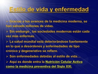 El documento destaca la discrepancia entre los avances en medicina moderna y el deterioro de la salud pública, vinculado a enfermedades crónicas y el estilo de vida. Propone la nutrición celular activa como un enfoque preventivo para mejorar la salud al proporcionar nutrientes adecuados. También se enfatiza la importancia de una dieta balanceada y el uso de suplementos naturales para cubrir necesidades nutricionales, especialmente en personas con condiciones de salud específicas.