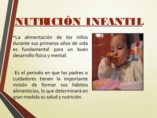 Este documento trata sobre la nutrición infantil y destaca la importancia de una alimentación balanceada durante los primeros años de vida para el desarrollo físico y mental de los niños. Recomienda dar lactancia materna exclusiva hasta los 6 meses y luego iniciar la alimentación complementaria con alimentos variados que contengan los nutrientes necesarios. También enfatiza la importancia de planificar las comidas semanales para los niños y acudir a controles médicos para verificar su crecimiento.