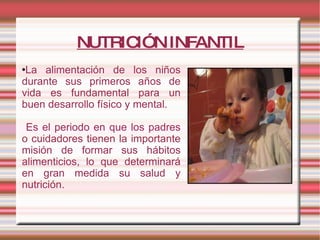 Este documento proporciona información sobre la nutrición infantil. Resalta la importancia de la lactancia materna exclusiva hasta los 6 meses y de una alimentación complementaria variada y nutritiva a partir de entonces. También enumera 10 alimentos clave para la dieta infantil como el desayuno energético, los huevos, las grasas saludables, el yogur, las frutas y verduras, la pasta, las papas, el arroz, las proteínas y las legumbres y cereales. Además, ofrece consejos sobre la alimentación del