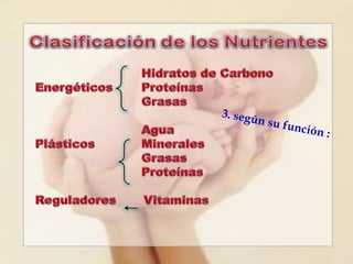 Este documento presenta información sobre nutrición y alimentación. Define nutrientes, clasifica los alimentos según su composición y función, y describe los requerimientos nutricionales recomendados para diferentes grupos etarios, incluyendo calorías, proteínas, hidratos de carbono, lípidos, vitaminas y minerales. Además, explica conceptos como dieta equilibrada y las leyes de la nutrición.