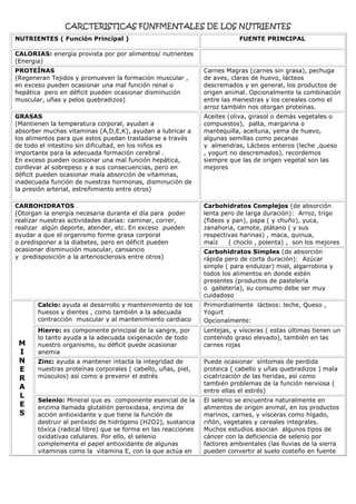 Este documento resume las características fundamentales de los principales nutrientes, incluyendo sus funciones, fuentes principales y posibles efectos de déficit o exceso. Los nutrientes principales son calorías, proteínas, grasas, carbohidratos, minerales como calcio, hierro y zinc, y vitaminas como las del complejo B, vitamina A, C, E, K y ácido fólico. Cada nutriente desempeña un papel esencial en el cuerpo y es importante obtenerlos de fuentes equilibradas para mantener la salud.