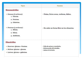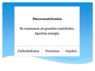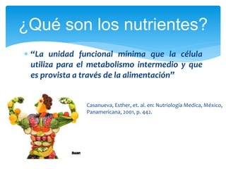 Los nutrientes son compuestos orgánicos esenciales que proporcionan a las células la energía y los materiales de construcción necesarios para el metabolismo y el crecimiento. Los principales tipos de nutrientes son los hidratos de carbono, lípidos, proteínas, vitaminas y minerales. Cada tipo de nutriente desempeña funciones específicas como proporcionar energía, formar parte de las estructuras celulares y regular los procesos metabólicos.