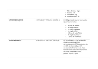 Este documento describe los ingredientes y nutrientes de una receta de lentejas con verduras. Proporciona detalles nutricionales de cada ingrediente, incluyendo lentejas, aceite de oliva, cebolla, puerro, ajo, pimientos, patata, tomate, calabacín, zanahoria, nabo, apio, hoja de laurel y pimentón dulce. Todos estos ingredientes pertenecen principalmente al grupo de hortalizas y verduras y son buenas fuentes de vitaminas, minerales y fibra.