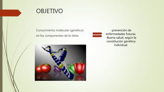 Este documento presenta una introducción a la nutrigenómica, que estudia la interacción entre los genes y los nutrientes de la dieta para prevenir enfermedades futuras según la constitución genética individual. Explica que la nutrigenómica permite determinar la susceptibilidad individual a desórdenes comunes como la diabetes, el cáncer y las enfermedades cardiovasculares. Finalmente, proporciona algunas referencias sobre la evolución de esta investigación nutricional.