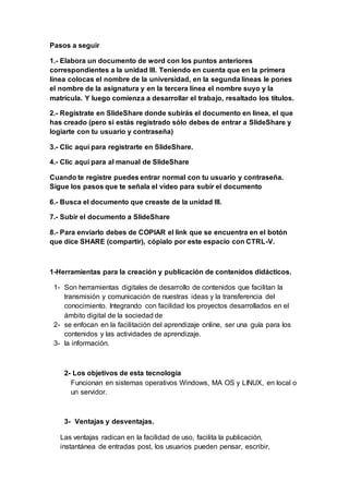 El documento proporciona instrucciones para un estudiante sobre una tarea relacionada con herramientas para la creación y publicación de contenidos didácticos. El estudiante debe investigar sobre este tema, crear un documento en Word y luego publicarlo en SlideShare, proporcionando el enlace. Se proporcionan preguntas guía sobre herramientas para la creación de contenido y ejemplos de tales herramientas como eXeLearning.