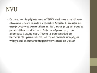 NVU es un editor de páginas web gratuito y de código abierto basado en Mozilla. Ofrece una interfaz WYSIWYG intuitiva y herramientas para editar HTML, CSS y contenido de forma visual o en código fuente. Incluye características como un servidor FTP integrado, editores de colores y CSS, compatibilidad con estándares web y gestión de proyectos. Ha tenido varias versiones desde 2004 y está disponible para sistemas Linux, Mac OS y Windows.