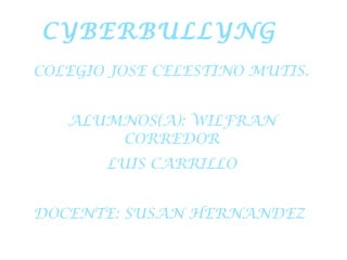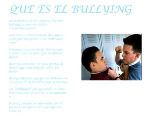 El documento describe el bullying y el ciberbullying, comparando sus características y efectos. Define el bullying como actos agresivos repetidos contra una víctima indefensa. Explica que el ciberbullying incluye acoso a través de mensajes, correos y publicaciones en línea, afectando a las víctimas incluso fuera de la escuela. Identifica siete categorías de ciberbullying como flaming, acoso en línea, ciberacoso, denigración, suplantación de identidad, revelación de secretos y exclusión.
