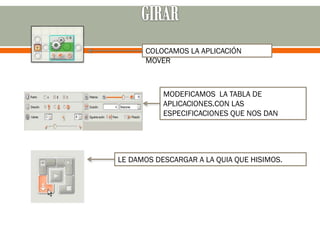 El documento describe las modificaciones realizadas a varias aplicaciones y tablas para descargarlas de acuerdo con las especificaciones proporcionadas. Se modificaron las tablas de aplicaciones, selecciones y bucle, y se colocó la aplicación mover en el recuadro indicado mientras se modificaba su barra.